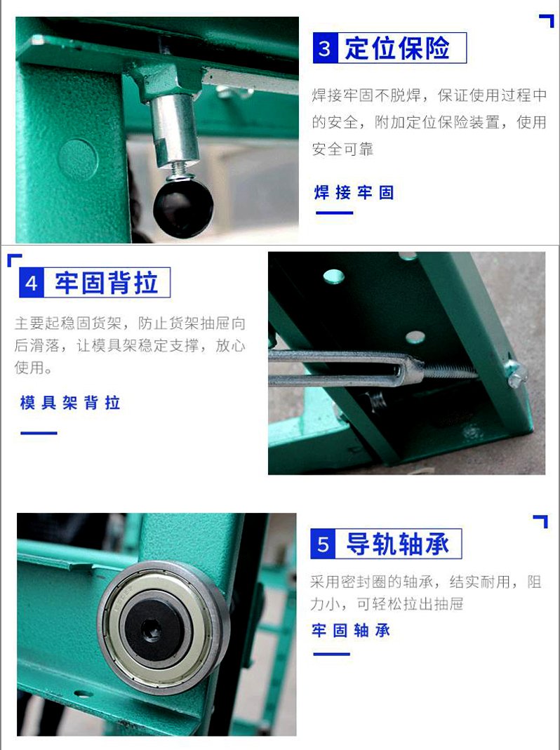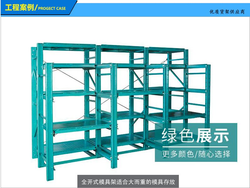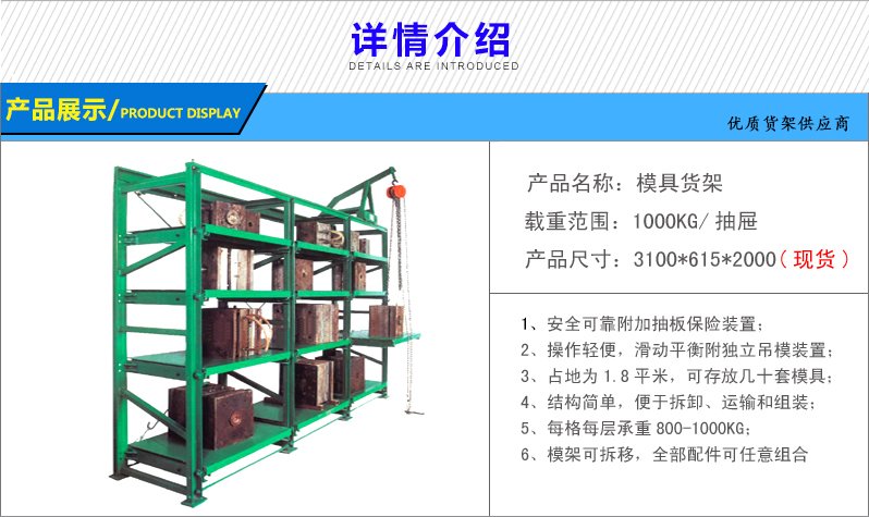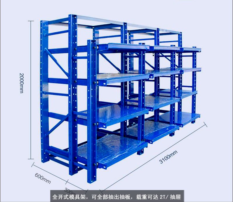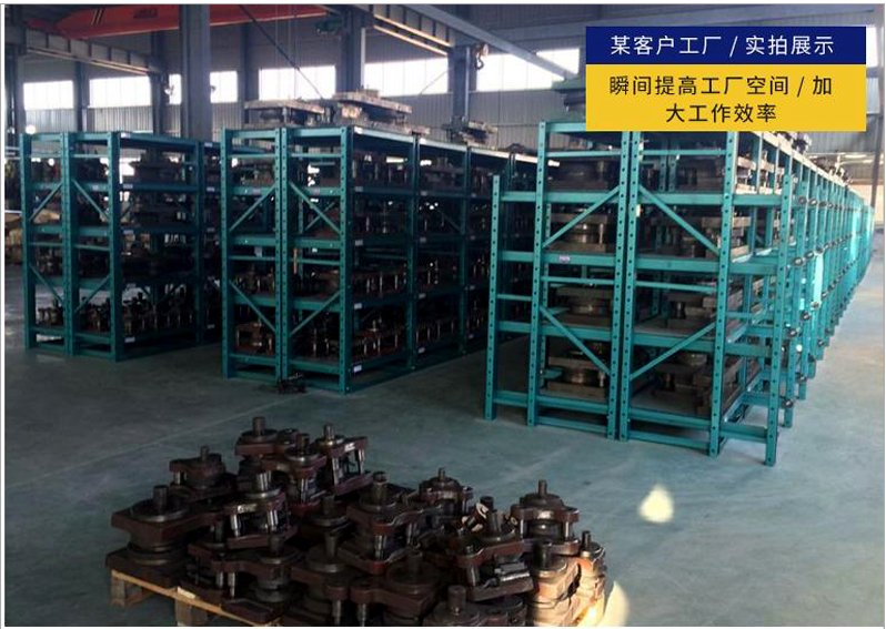 模具貨架適合于存放模具等機械加工塊的存放。占地少、承重大、分類詳細(xì)、存取方便。抽屜式滑道,可以80%抽出,操作簡易,安全,是現(xiàn)代化工廠的維修及加工車間的工位器具。